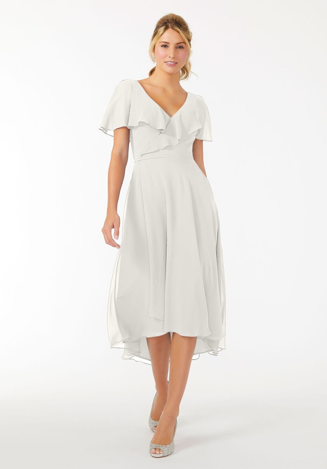 Crepe back satin keyhole bridesmaid dress, style 21710 in desert rose, by Morilee, left; Midi flutter sleeve chiffon bridesmaid dress in storm, style 21704, by Morilee, middle; Sweetheart Chantilly lace bridesmaid dress with off-the-shoulder sleeves by Morilee, style 21730 in desert rose, right.