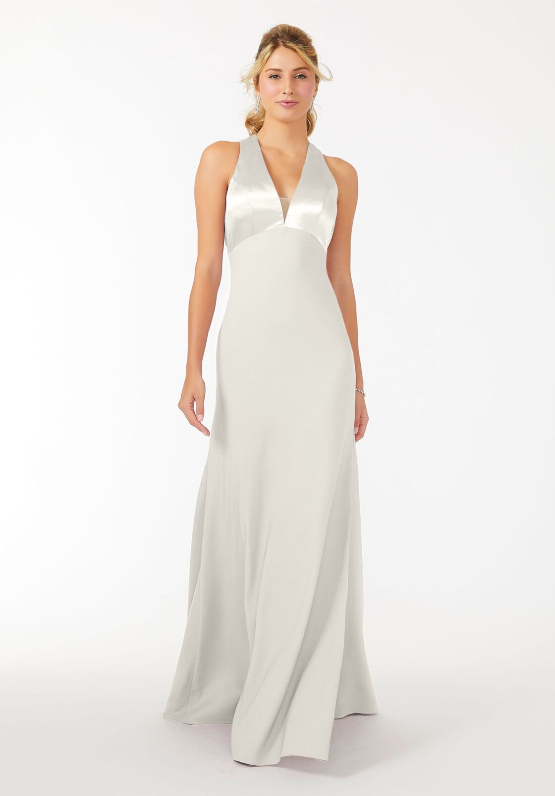 Strapless satin back crepe gown (1558) by Allure Bridesmaids, left; Kenneth Winston chiffon bridesmaid dress in sterling, style 5317, right.