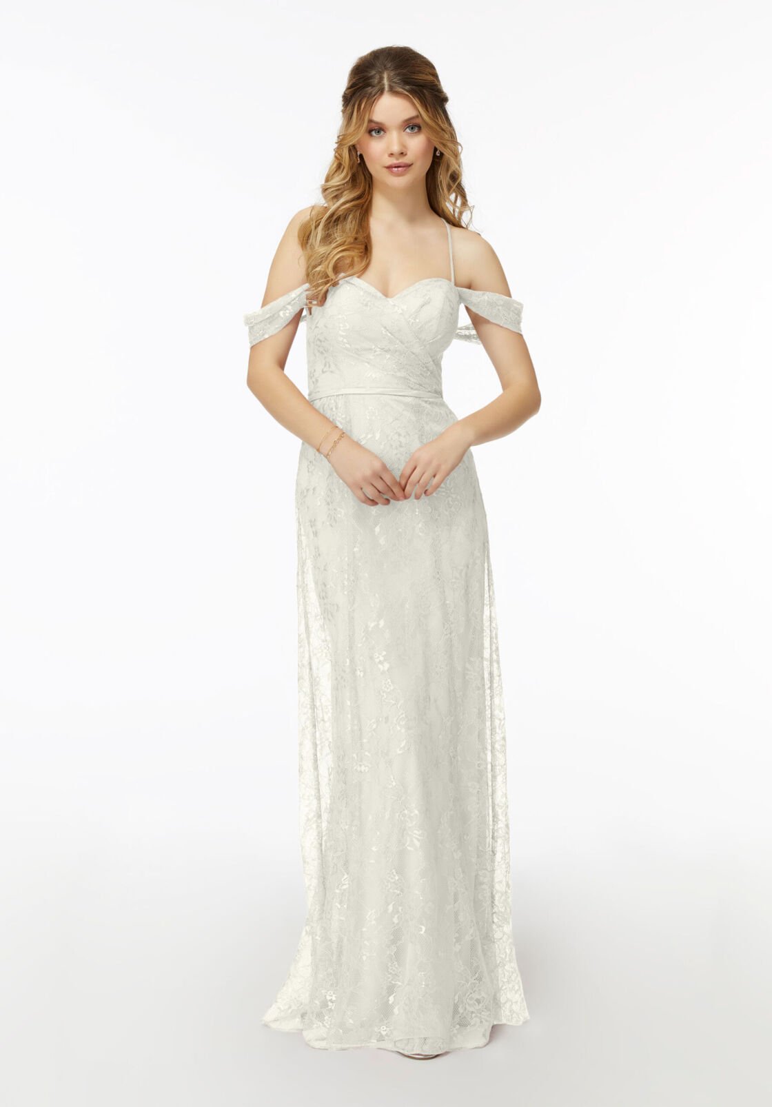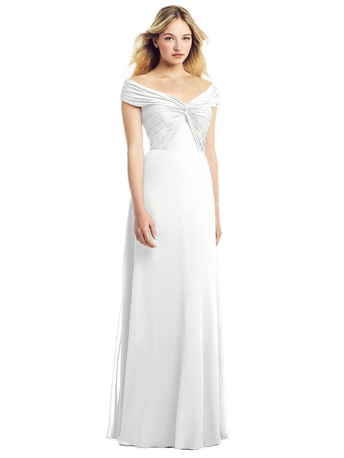 After Six style 1555 from the Dessy Group in lux chiffon, left; off-the-shoulder pleated bodice chiffon gown from Jenny Packham at the Dessy Group, style JP1036, right.