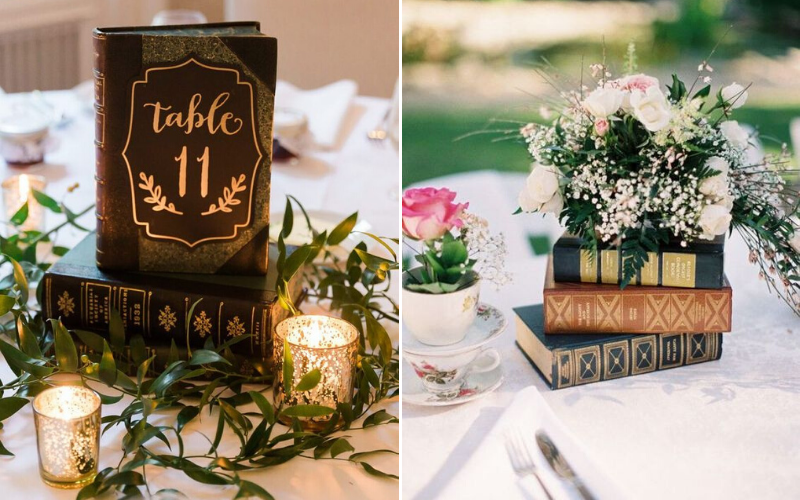 Why not add a stack of books to your wedding tables? Literature loving couples will want to have books present as their centrepieces and the more retro-looking, the better! We love the addition of flowers, leaves and candles which create an aesthetically pleasing look. Add a book the two of you both love for an even more personal touch!