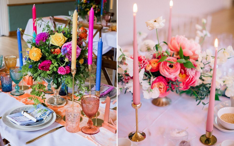 Why not create a centrepiece that brings added colour and ambience to your wedding by simply painting wooden candle holders to match candles of the same hue? This is a look that will definitely set your wedding apart from all the rest and can really jazz things up for couples wanting a bold look.