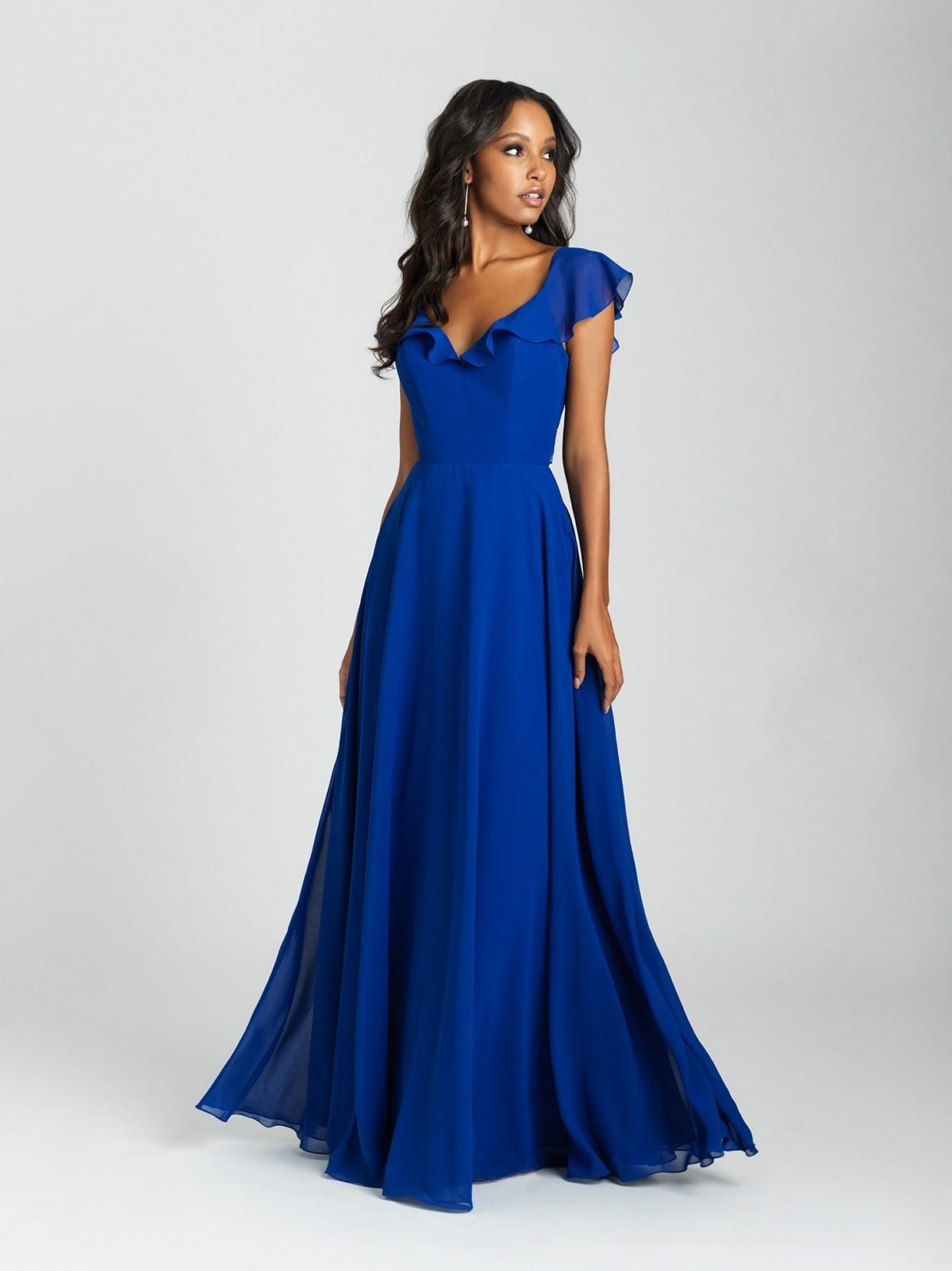 A fluttering chiffon ruffle edges the neckline and cap sleeves of this A-line gown, left, style 1656 in royal blue from Allure. Ruching and a crossover bodice lead to an open back with a touch of lace in style 1650 in Arctic blue, right, from Allure. Stockist Orchid Bridal Studio.