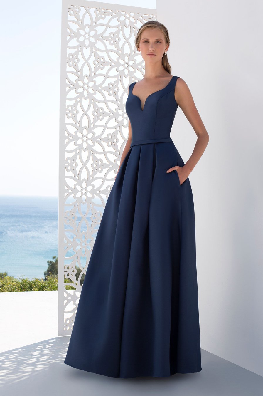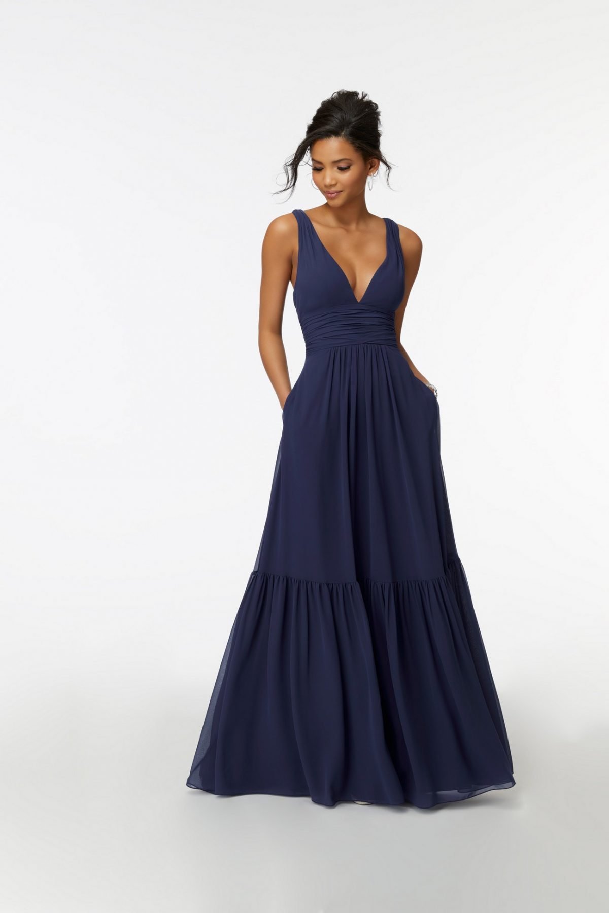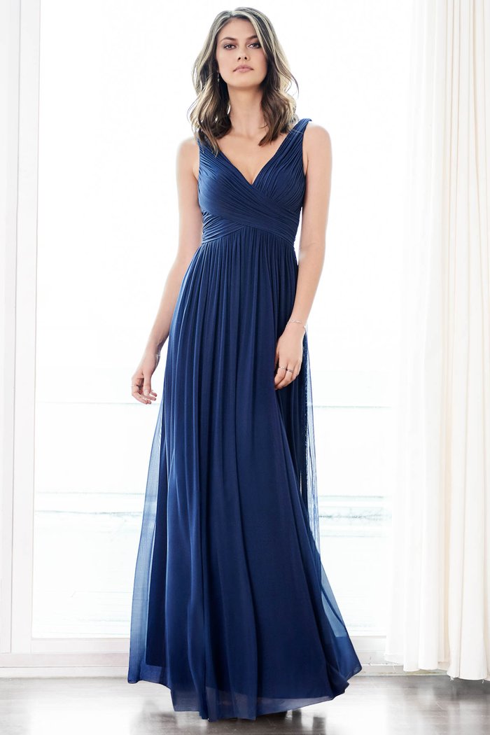 A-line Mikado gown in navy, left, style 1663 from Mark Lesley Bridesmaids. Pleated chiffon A-line gown in woaded blue, style 1685a from Mark Lesley Bridesmaids. Stockist Angel Star Bridal.