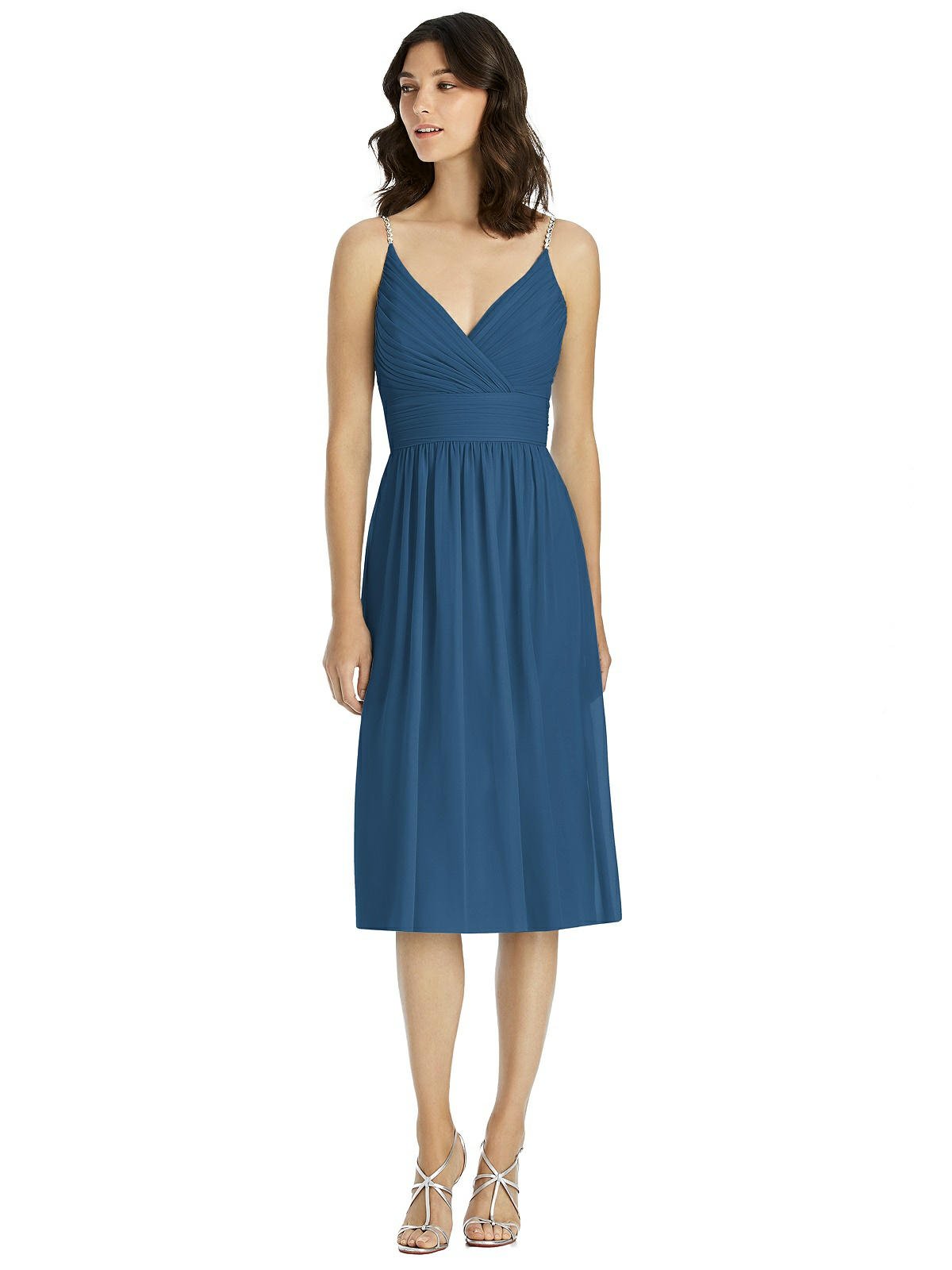 Jewelled strap draped wrap cocktail dress in dusk blue, Jenny Packham style JP1024 from Dessy, left. One shoulder chiffon maxi dress with shirred front slit, After Six style 1555 from Dessy. Stockist La Bella Sposa.