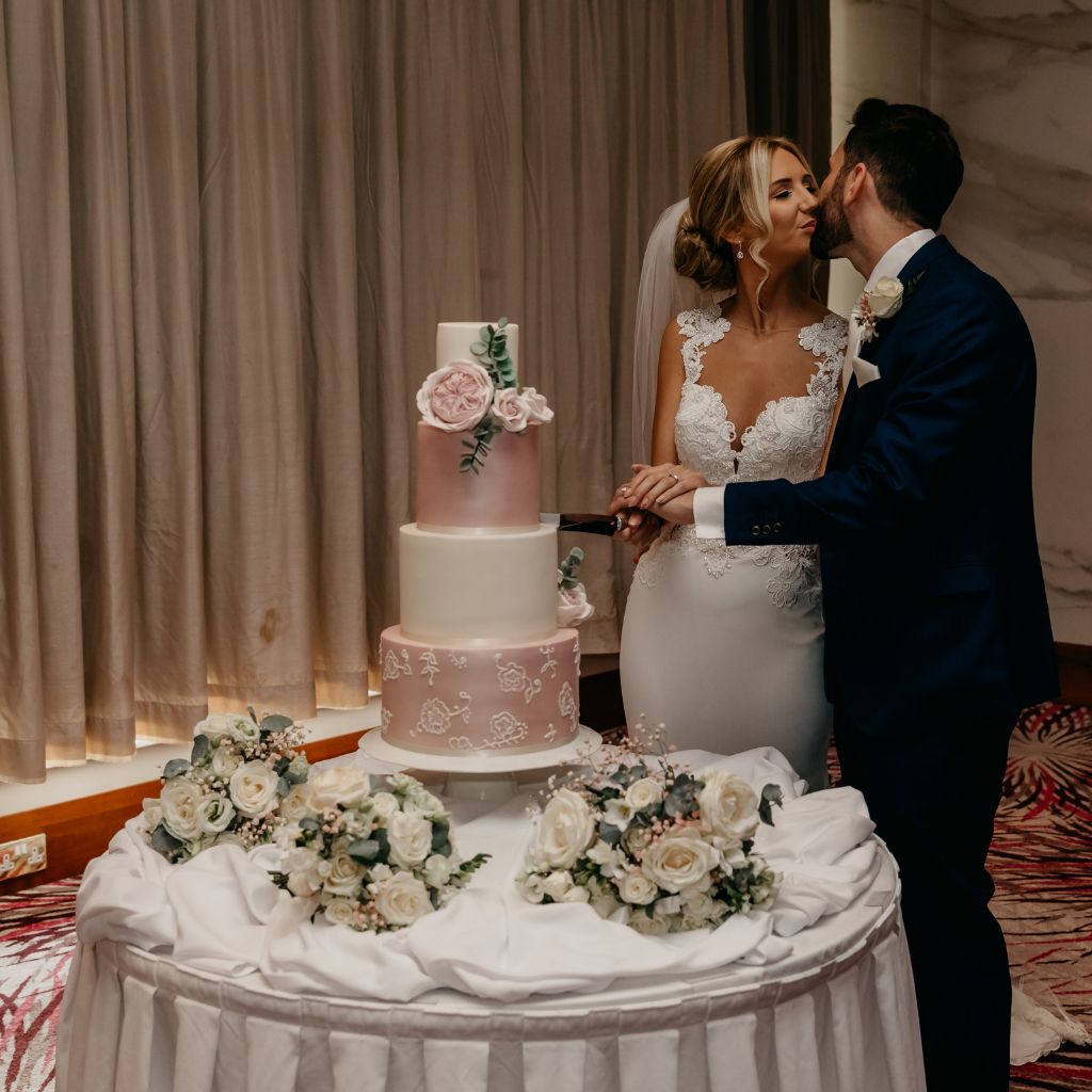 The simple and elegant cake was designed and created by NI Cake Design. The owner of the company, Landa, knew what Hayley wanted without the bride even having to say! ‘She created something better than I could have ever imagined,’ comments the bride. Landa also took a sample of the bridesmaid dresses and incorporated the colour and lace detail onto the cake.