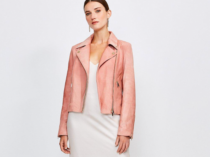 For an edgier look, this beautiful pink biker jacket from Karen Millen adds just the right touch of rock and roll glamour.
