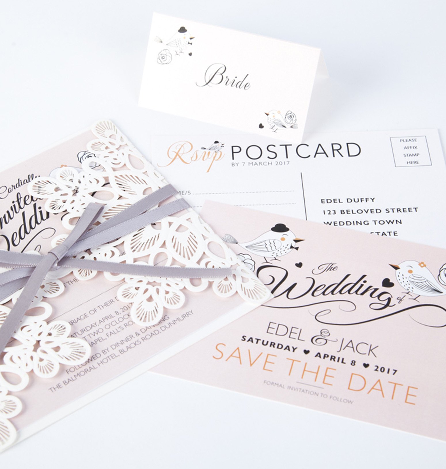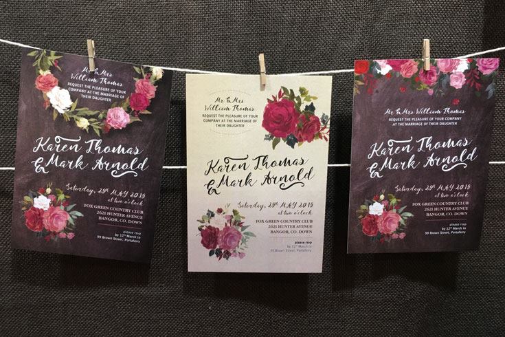 Much like your wedding flowers, your color palette can also play a huge role in your customized stationery. Going for an Autumnal vibe? Make sure you incorporate the same colours you want for your day in your invites and stationery. Whether you use the bridesmaids’ dress colours, the linens, or the florals as inspiration, it’s nice to have some kind of nod that ties the entire colour palette together. Check out these cute invites from Eden Stationery in Newtownnards for a pop of colour!