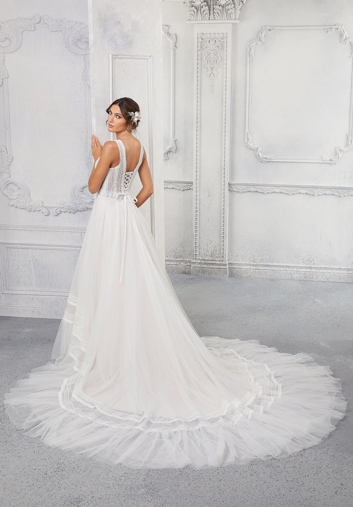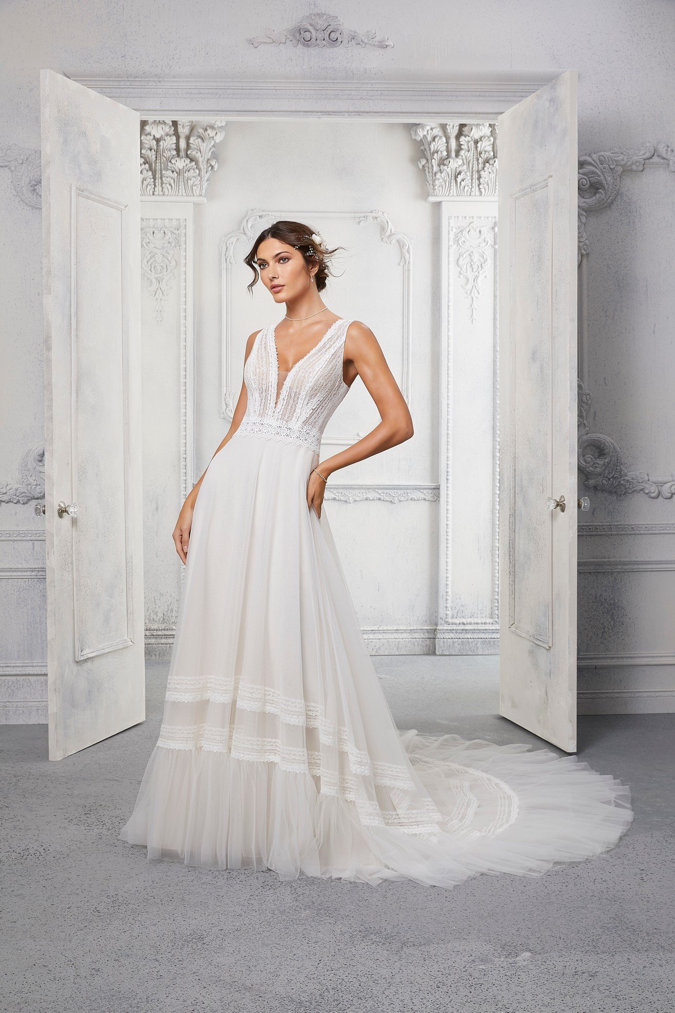 This Clara wedding dress (style 5916) from Morilee is a breath of fresh air. The A-line silhouette floats off the body and the boho-inspired lace bodice provides dainty detail. The frilly, flounced hemline makes this gown perfect for the free-spirited bride.