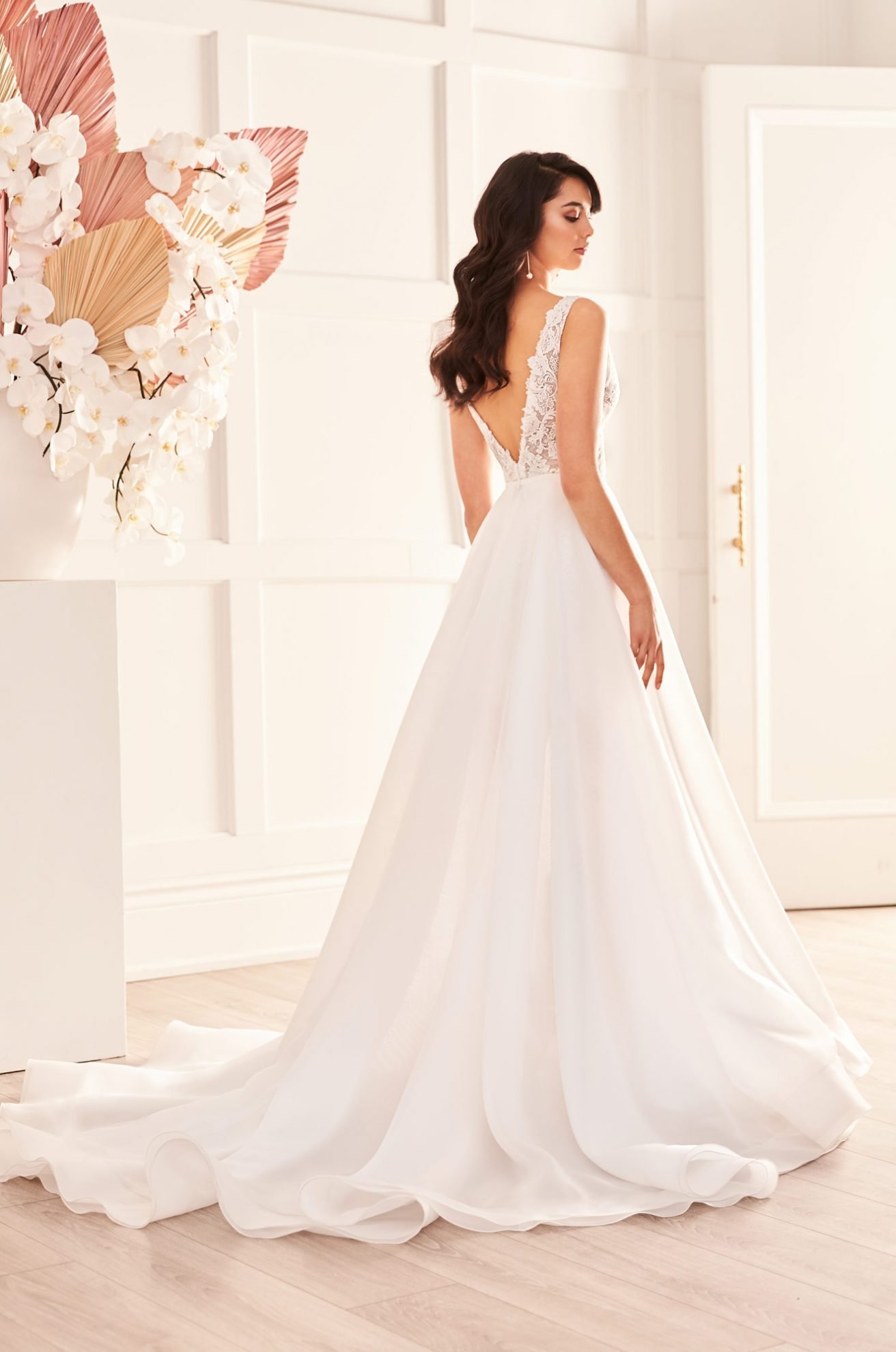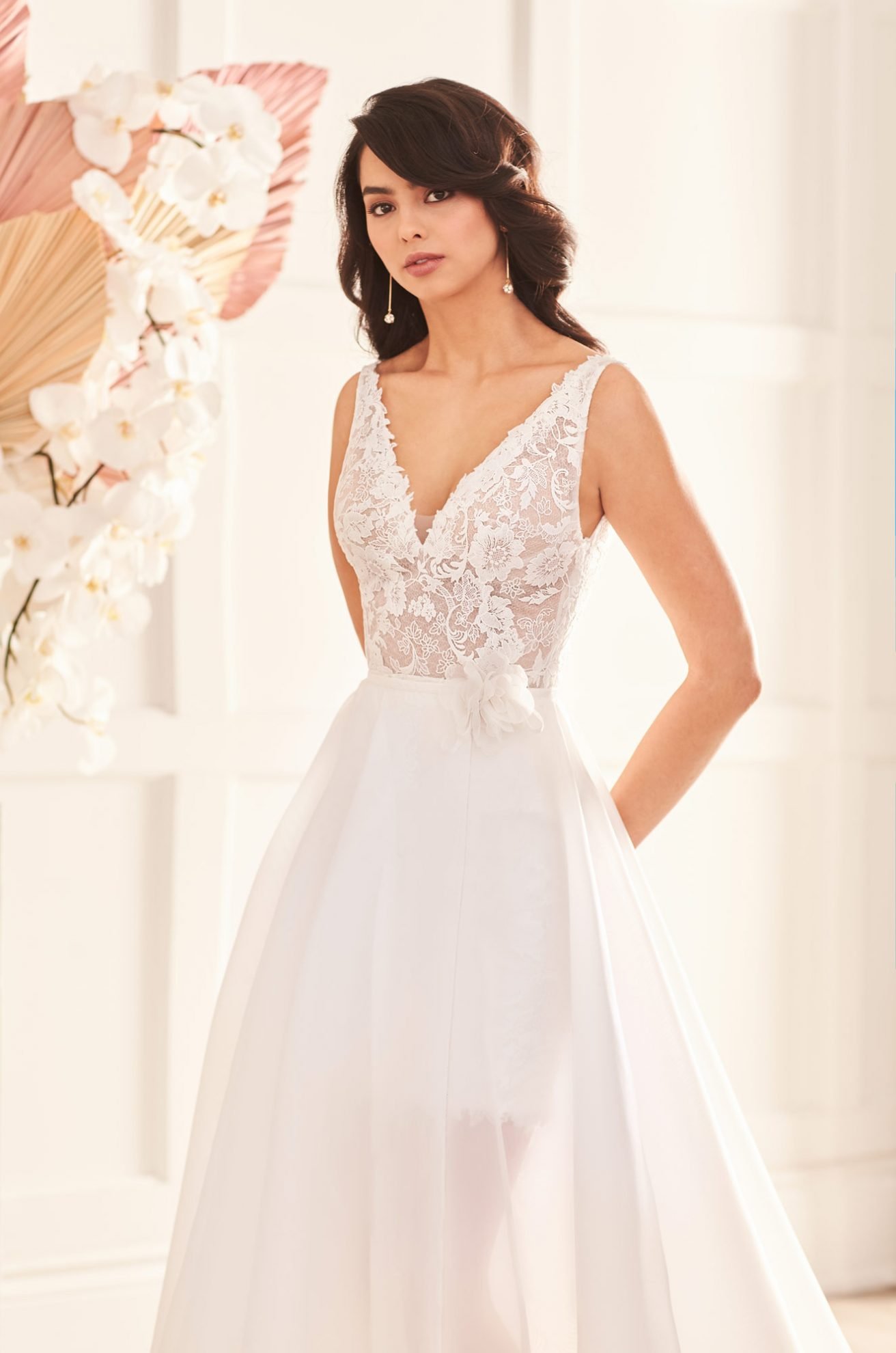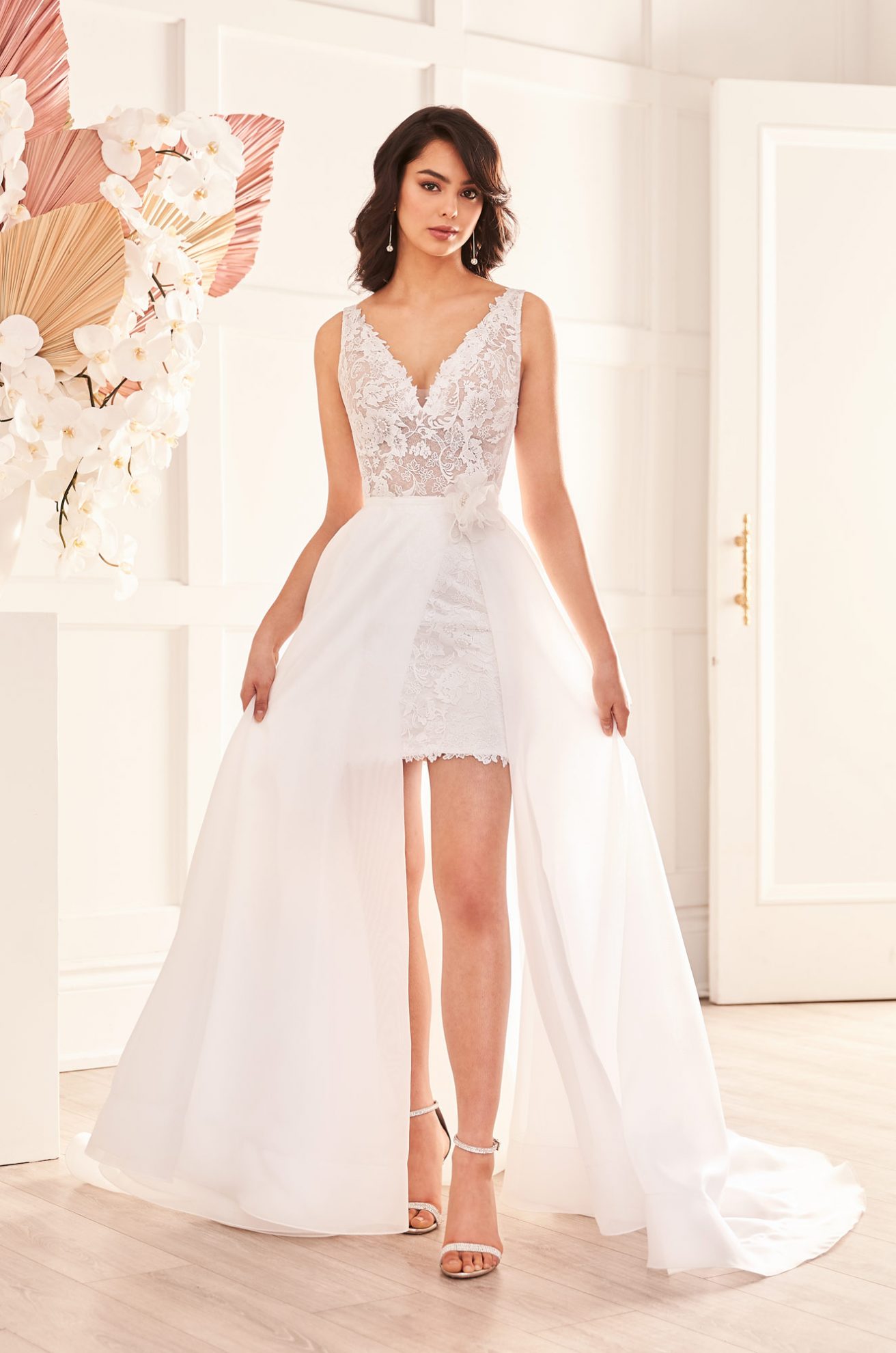 We’re seeing designers adding fine overskirts to their gowns, which means that not only are they adding some delicate textural elements to the outfit, but providing options for two looks in one. This dress, style 4959 from Paloma Blanca, features a sheer lace bodice, lined in natural Italian tulle, with a V-neckline and a low-cut back, and includes a removable side slit organdy overskirt that has been designed to move beautifully with your body as you walk down the aisle. The skirt is fully removable revealing the striking knee-length lace skirt underneath – the perfect day-to-night lightweight look and ideal for destination weddings.