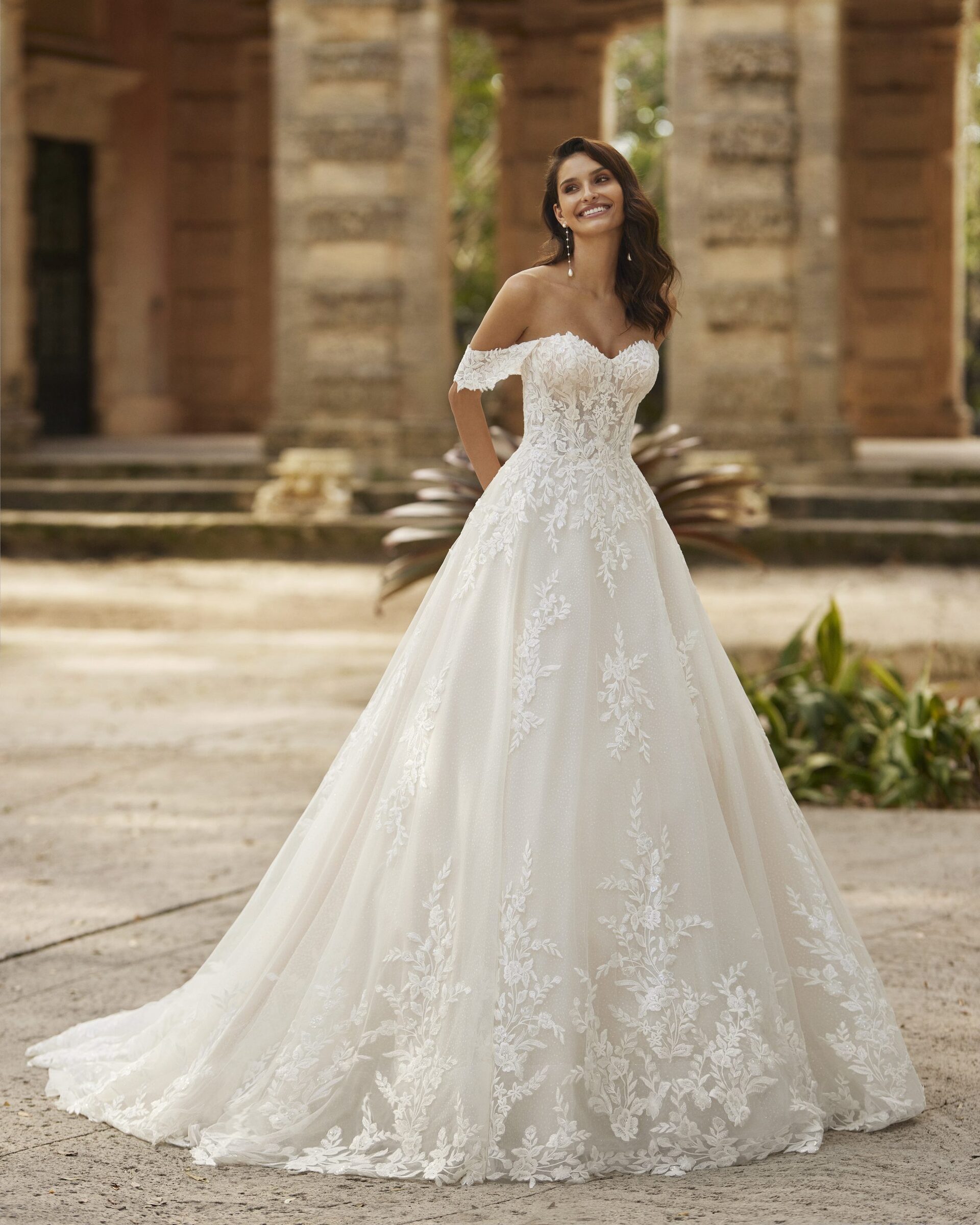 You will definitely feel like a princess in this A-line wedding dress from Aire Barcelona. Crafted in tulle embellished with lace and beadwork, it features a strapless neckline, open back and draped straps – perfect for brides who don’t wish to have that full sleeve look.