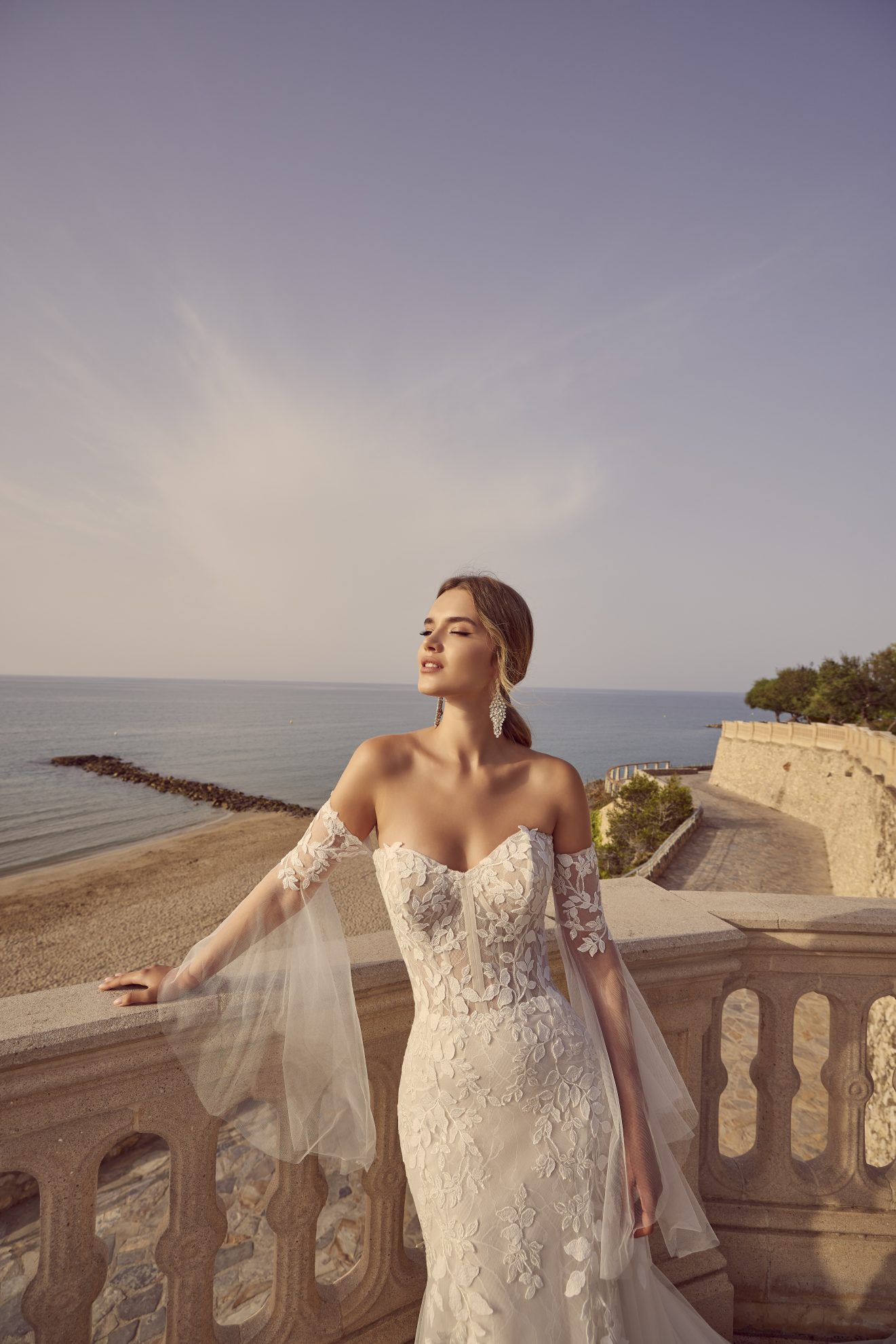 Berta is a brand well known for its sexy bridal styles and this stunning corset dress with on-trend thigh split and silver sparkle doesn’t disappoint. Detachable fingerless glove style sleeves pair perfectly with this dress style and offer another option for any bride wanting to indulge in the sleeve trend in 2024.