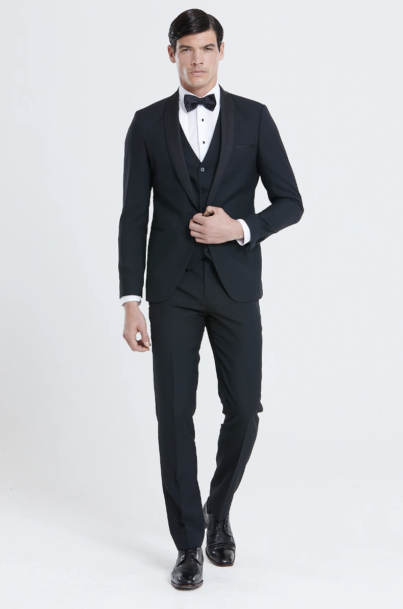 It’s crafted from the finest fabrics and finished with debonair details including the elegant satin shawl collar. The black shawl collar tuxedo becomes a sophisticated choice for all black tie events.