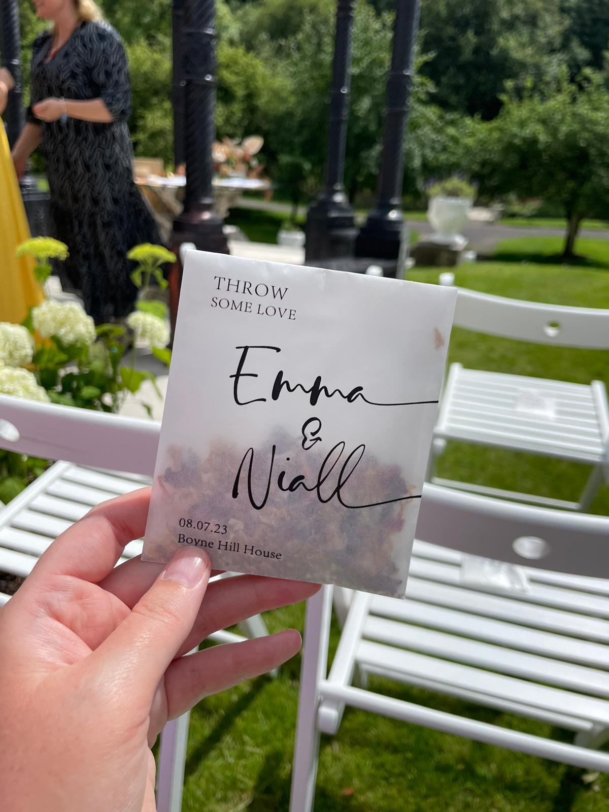 ‘So I did all the planning myself from start to finish,’ explains Emma. ‘I loved the planning process as a whole but there were definitely some periods of stress. Now I actually miss the planning process, it was such a massive part of my life for two years that it feels like I’m missing a little piece of me. I’m a little jealous of all the brides to be and this part of their wedding journey. I started planning IMMEDIATELY, from the engagement night (because Niall fell asleep from the exhaustion of proposing) meanwhile I was on Pinterest at 3am in the Wineport Lodge in our beautiful suite,’ she laughs. ‘I began listening to wedding podcasts etc, but to be honest I soon let all those influences of the planning go because I found that too many opinions were pulling me away from what I actually wanted our wedding to look like and feel like. Trends and social media can be great for inspiration but equally they can steer you in the opposite direction and make you doubt your own vision. I can admit, I love to be organised when needed and I am a planner so I was READY to plan the most important day of our lives.’