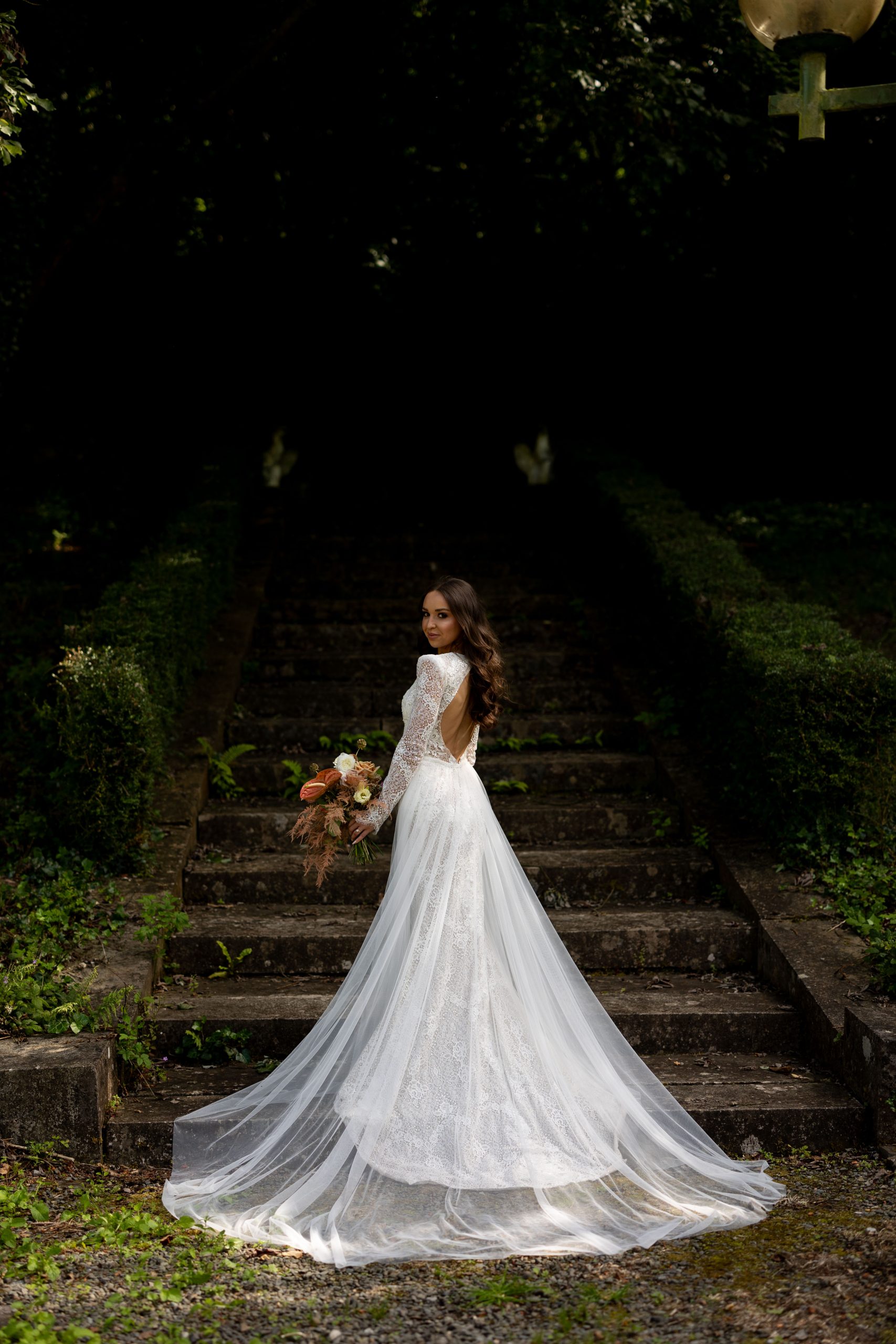 My experience with Forever Bridal in Belfast was fantastic, they were so helpful and friendly. I had the opportunity to try on lots of different styles (dream come true!). I was really influenced by the “dramatic sleeve” trend (March 2022) and I thought this was the route I would go but when I tried them on, I just felt they weren’t the one and I didn’t want to look back and think I picked my dress based on a trend. I had travelled to a number of different boutiques but Forever Bridal really felt like my style, it stocked some incredible designers and I really wanted to make a statement with my dress. I loved the idea of a classic design because it’s timeless but I wanted some flare and a modern element because truthfully I wanted to feel out of this world in my wedding dress. I fell in love with Pillar by Woná Concept because of the lace sleeve with the scalloped edge (timeless) but the drama of the overskirt/backless element and the modern twist with the structured shoulder. I tried on the dress, fell in love but I wanted to make sure so I didn’t buy on the day and instead I had already booked in for another fitting in another boutique so I attended that and it just solidified what I already knew; Pillar was my dress and I couldn’t wait to wear her on my wedding day. Also I only ever brought my mam to any of my try-on’s from the outset until I knew I had found the one and then I brought my bridal squad along. The dress has drama which I loved but I was still super comfortable and I could party the night away with everyone. It is funny, when I think back, the wedding dress I chose was the visual I had in my head many moons ago, I wasn’t one to dwell on when I would get married, but the long lace sleeve, low back was always in my mind’s eye and I never wanted to wear a veil which also came to fruition.