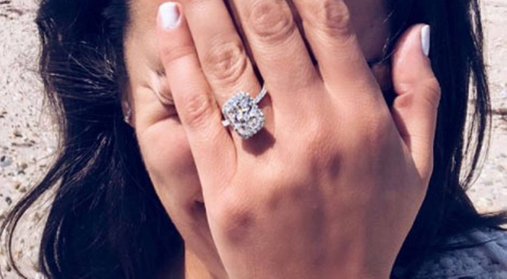 In the picture, Lea can be seen hiding her face with a close-up of her INCREDIBLE four carat diamond engagement ring with the beach in the background. The breathtaking ring is a beautiful elongated radiant cut surrounded by a diamond halo and was reportedly personally designed for her by Zandy himself; who had recruited Leor Yerushalmi and The Jewellers of Las Vegas to work on the piece.