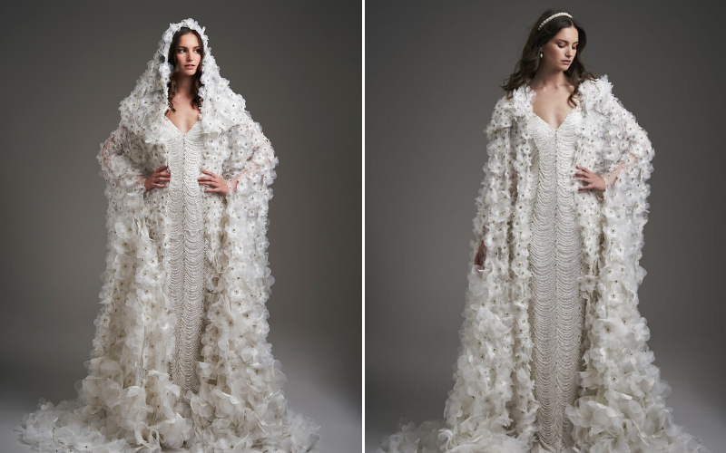 Why not go for something a little different? Two-piece bridal sets have rose in popularly in recent years and it’s easy to see why. Add drama to a sleek white dress with a removable floral top or dramatic cape like this look from Halfpenny London.