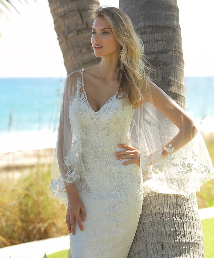 “Bell sleeves are very big at the moment as well as 3D floral detailing on dresses, and shimmer and sparkle also – they are the three major trends right now and they’re going across the board from the beautiful A-lines to the fit and flares and the fishtail gowns,” she says.