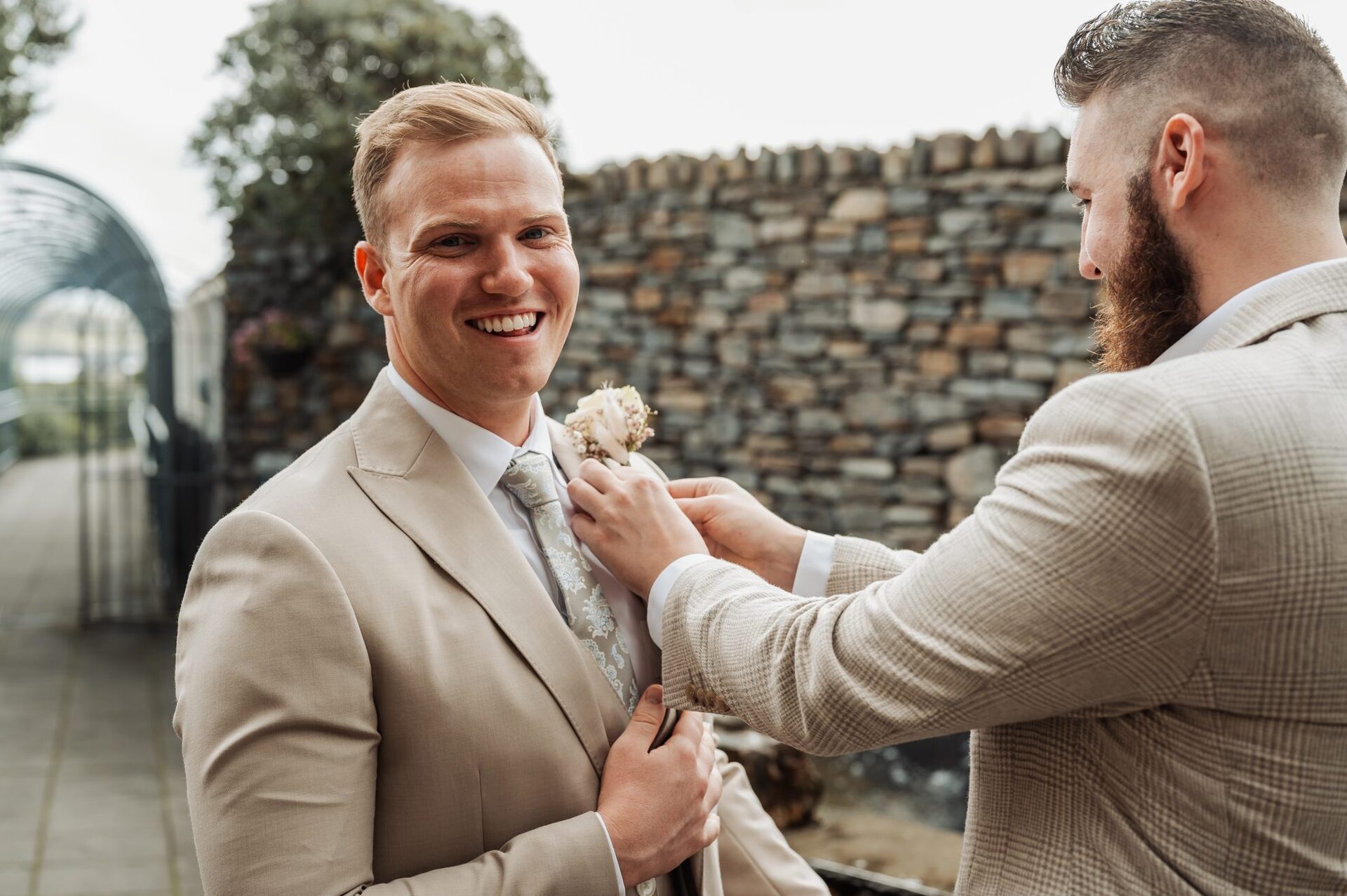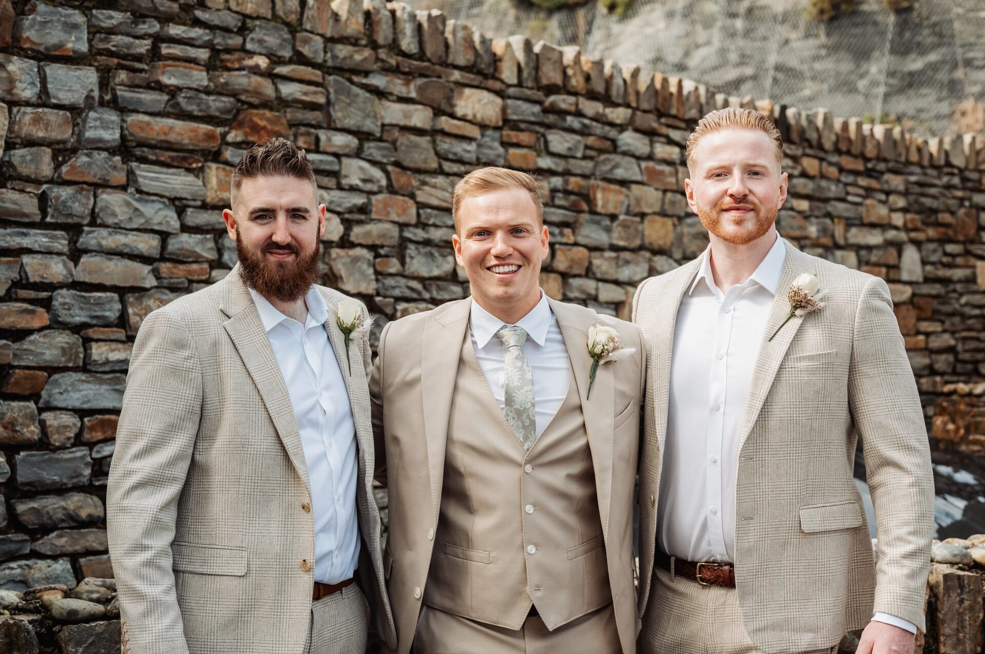 Connor’s suit was from Moss Bros in the French Collection. The Groomsmen’s suits were also Moss Bros. The whole theme of the wedding was beach/neutrals therefore it was important to me to have the men in a full neutral suit or black trousers and neutral jacket. To keep them more casual we had them wear open shirts with brown belts and shoes which kept it relaxed and summery.