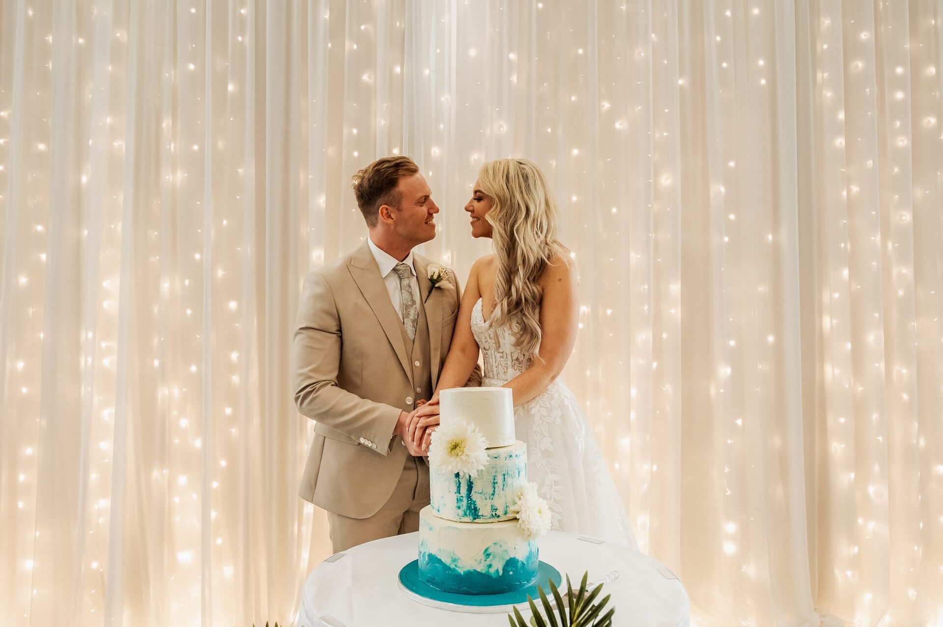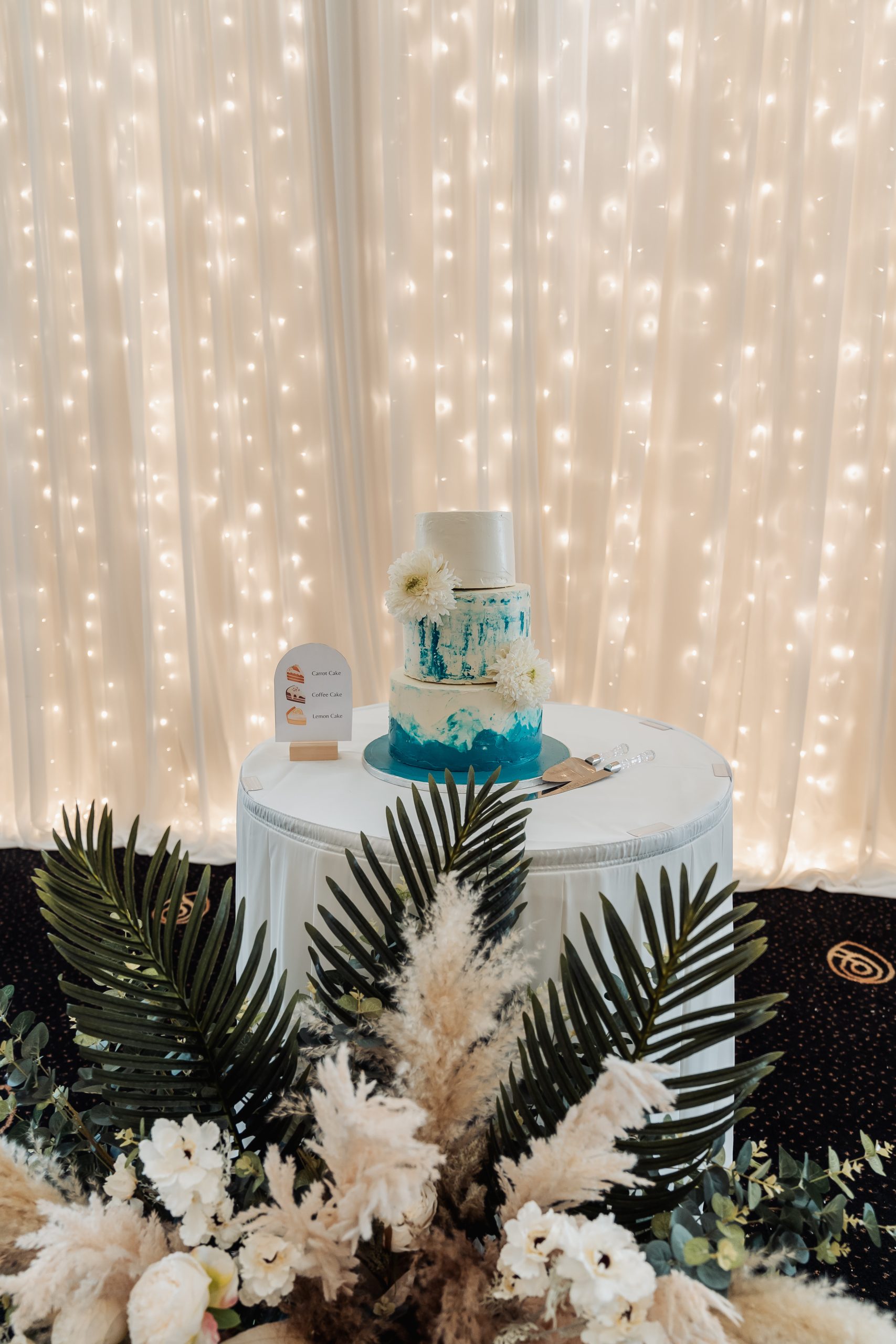 For our cake, our family friend works at the Rosehip Cafe in Banbridge. We asked them if they could make our wedding cake. Within a week we had a consultation and enjoyed tasting multiple incredible flavoured cakes. We ended up going for a three tier cake, with Lemon (base), Coffee (Middle) and Carrot Cake (Top). We wanted to go a bit different for the flavours to your typical fruit or chocolate cake and people really enjoyed the refreshing change. The vision was to have a white icing with blue ocean waves to showcase the beach theme of the wedding.