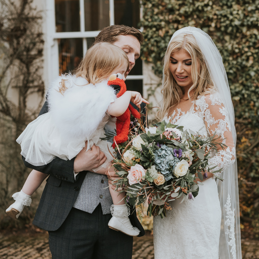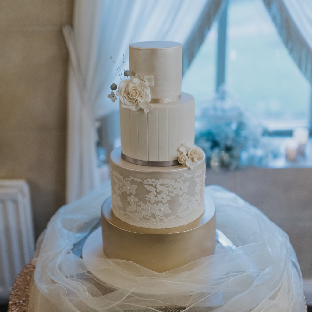 The Elite Cake Company provided a four-tier wedding cake, being decorated with gold, ivory and grey features. There were decorative white icing flowers, similar to those in the bouquet, with grey and gold ribbons tied between layers. Victoria adds ‘the cake was important as it incorporated all our colours from the flowers to the dresses together; I wanted everything to flow together.’
