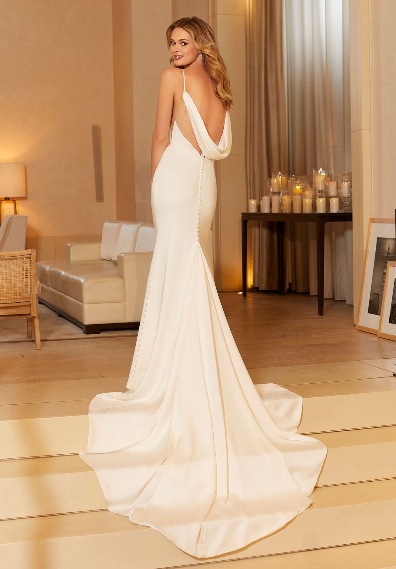 This Cambria style wedding dress from the Morilee Starlight Collection is the definition of sleek sophistication. The ultra-chic and simple V-neck gown gives way to a breathtaking back. Illusion side cut-outs meet up with a sheer back detail, accented by a gorgeous draped cowl back.