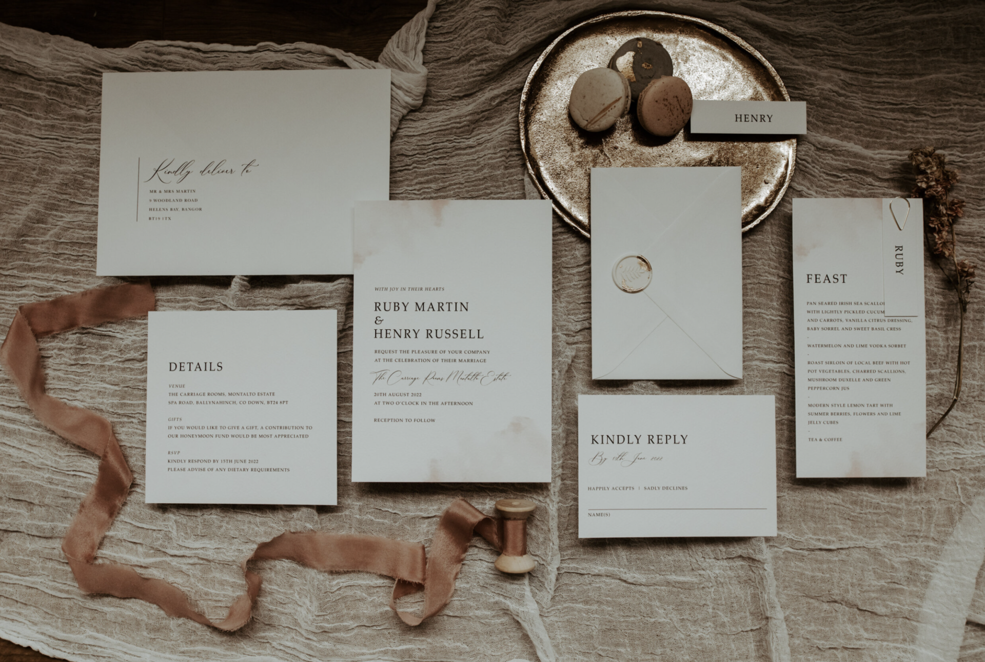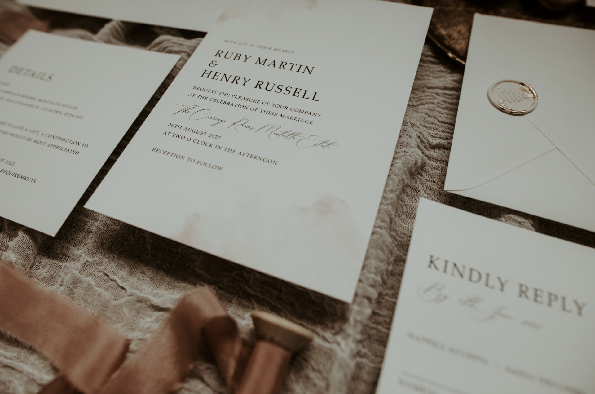 Embrace the simplicity of black and white in your wedding stationery to bring a classic twist to the overall theme. This stationery, from Freckles and Fern adds a watercolour wash to the invitations to bring a unique twist to the monochromatic style.