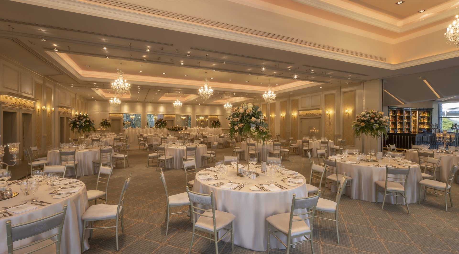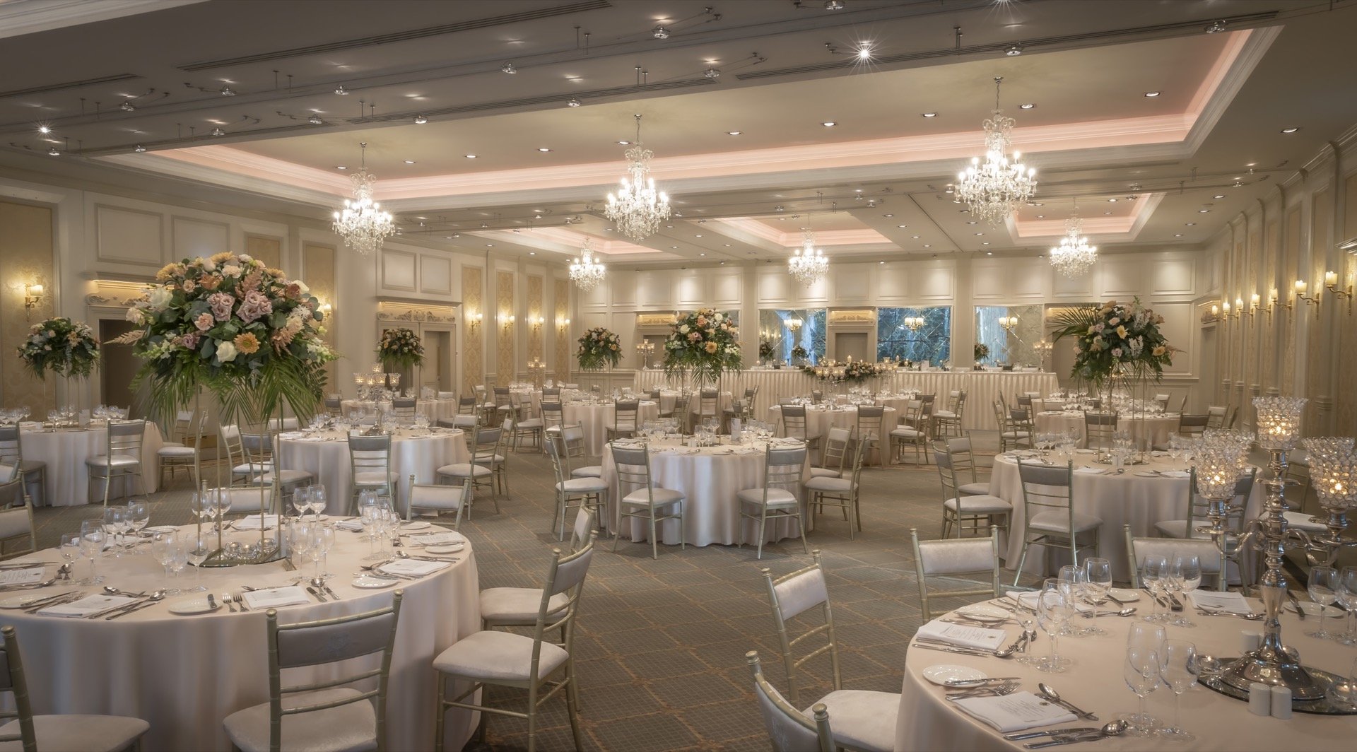 As a luxury castle hotel, Lough Rynn Castle can accommodate up to 290 guests in the Grand Ballroom, with floor to ceiling glass wall offering a picturesque view over the natural woodland and lake, an ideal backdrop to inspire the perfect day.