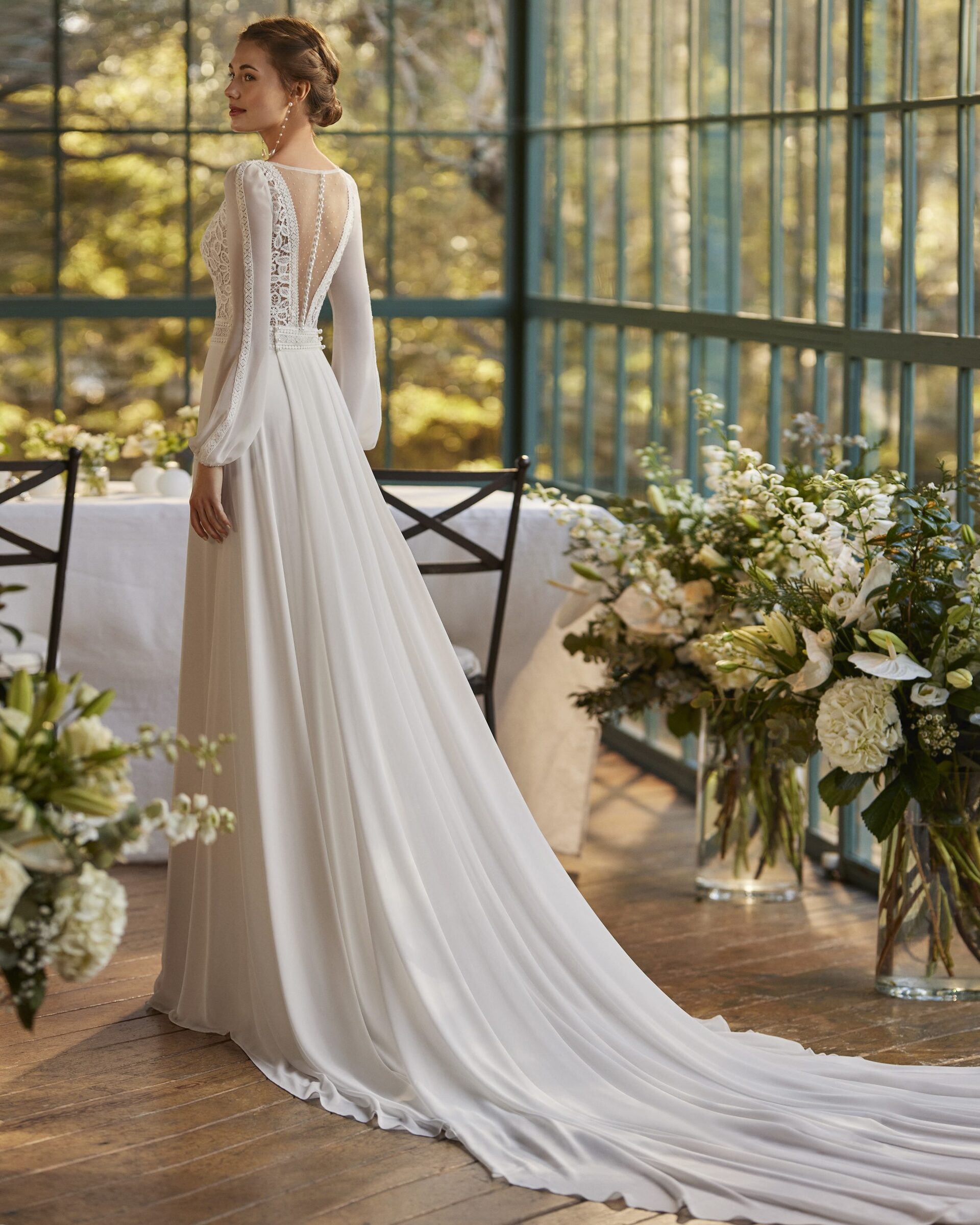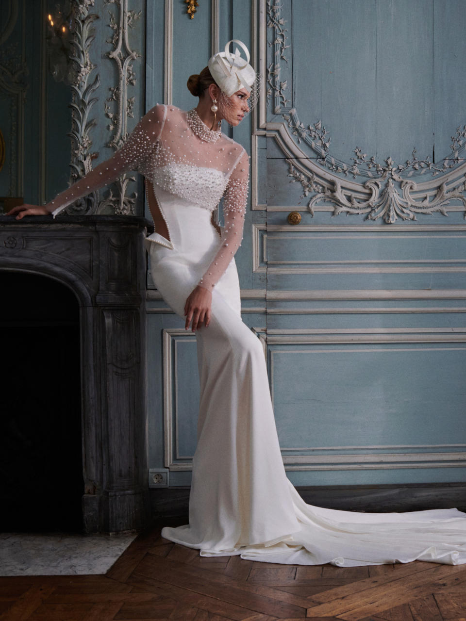 Accessorise your wedding dress with sheer panels thoughtfully. Keep jewellery simple and elegant to let the sheer panels take centre-stage. Consider a delicate veil or hair accessory to complement the ethereal quality of the sheer panels.