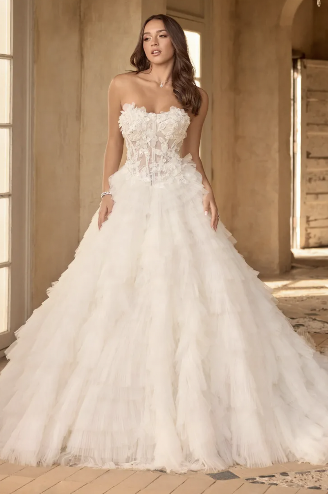 The couple exchanged heartfelt vows, surrounded by their closest family and friends, as the sun set on the horizon. The reception was a celebration of love and joy, with a live band serenading guests as they danced the night away! We are obsessed with this dress – it is truly one of a kind. For a similar look, why not go for a dramatic ballgown that will give the wow-factor!