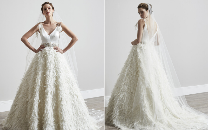 Whether a full feathered skirt, delicate feathered accents on the bodice or a feathered cover-up, you will literally float down the aisle in one of these stunning bridal gowns perfect for the fashion-forward bride who wants to wow in something utterly unique. Check out these gorgeous designs below!
