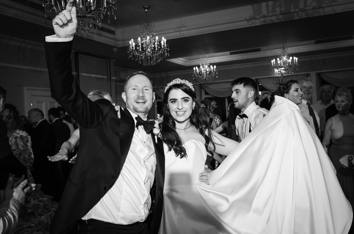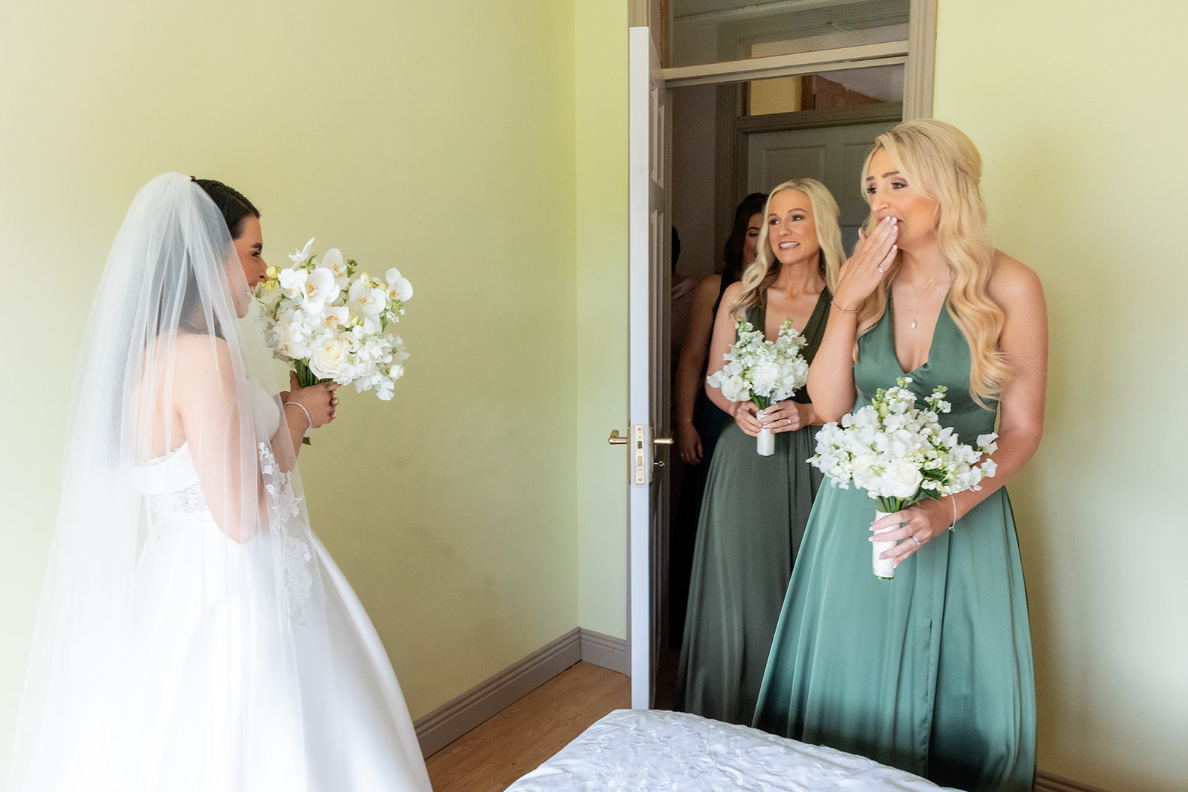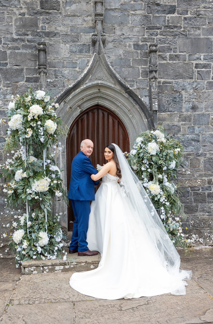 One of my best friends told me to try one more in Galway. She said you mightn’t find your dress, but you will come out of the appointment with a clearer head. Fast forward to meeting Eoghan in Thistles, I found the one! Eoghan was direct and honest, I loved the honesty! I went with a strapless Mikado gown by Justin Alexander, as it had gorgeous beading on the back and was the perfect mix of modern and preppy! I matched it with a cathedral-length veil and simple diamond accessories. For the evening, I changed into a fully beaded floor-length dress with a slit by Nadine Merabi. It was so fun to wear and fit so well without any alterations.