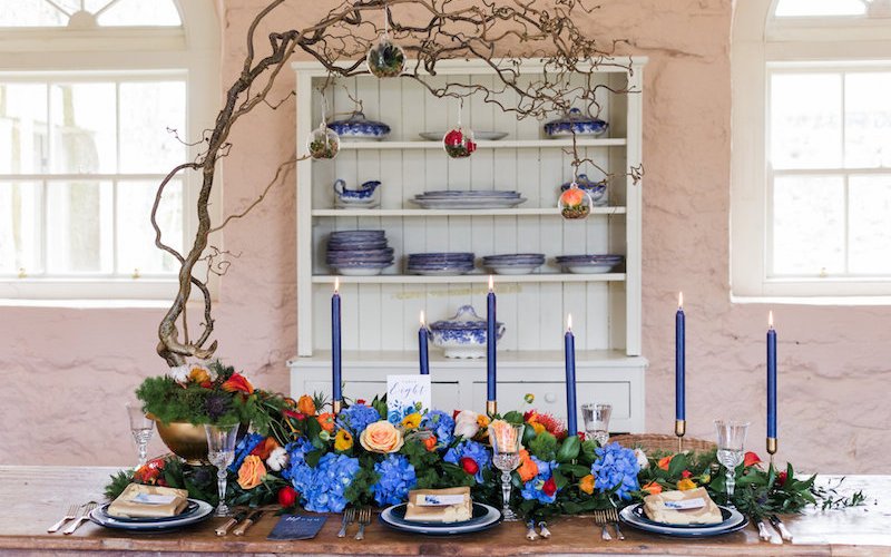 Golden hues and vintage vibes perfectly complement this whole scheme. The use of the golden cutlery adds warmth and richness to the colourful blooms decorating the table in bold shoes of blue, red, orange and green.