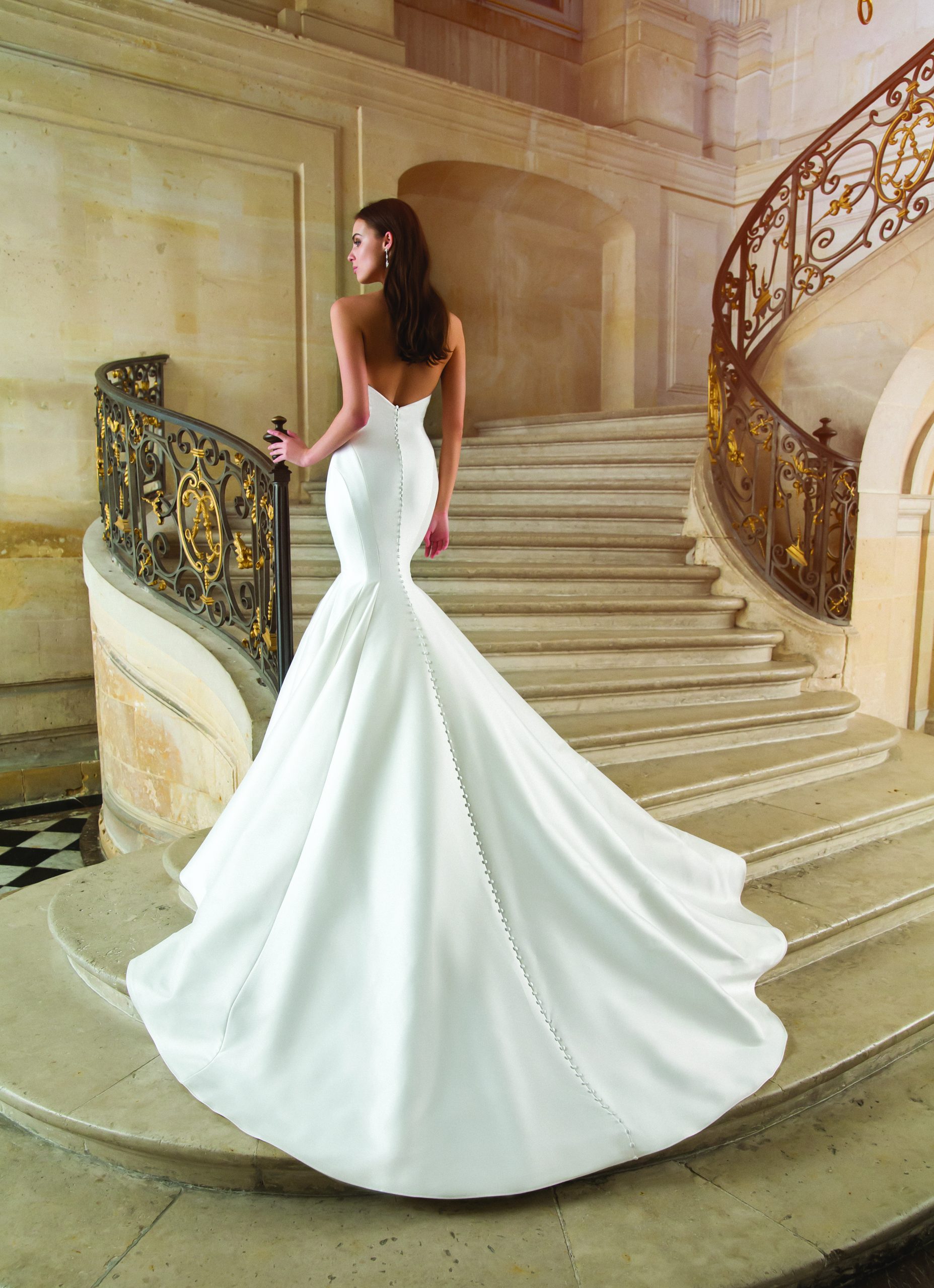 The trumpet silhouette is fitted through the bodice and hips, then flares out gradually from mid-thigh to create a trumpet-like shape. This style is perfect for brides with hourglass or pear-shaped figures who want to highlight their curves. It may not be as flattering for apple-shaped or petite figures.