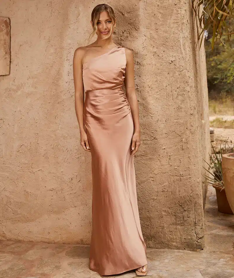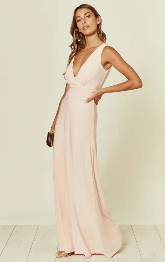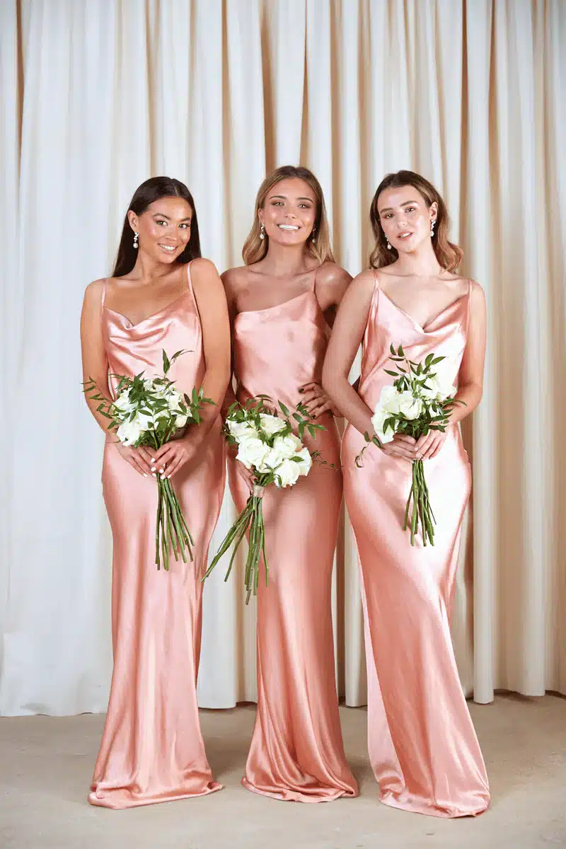This dress is made from a stunning peach matte satin based material that features a flattering cowl neck and drapes beautifully to the floor. Pair your bridesmaids in our other matte peach options for the ultimate mix and match look.