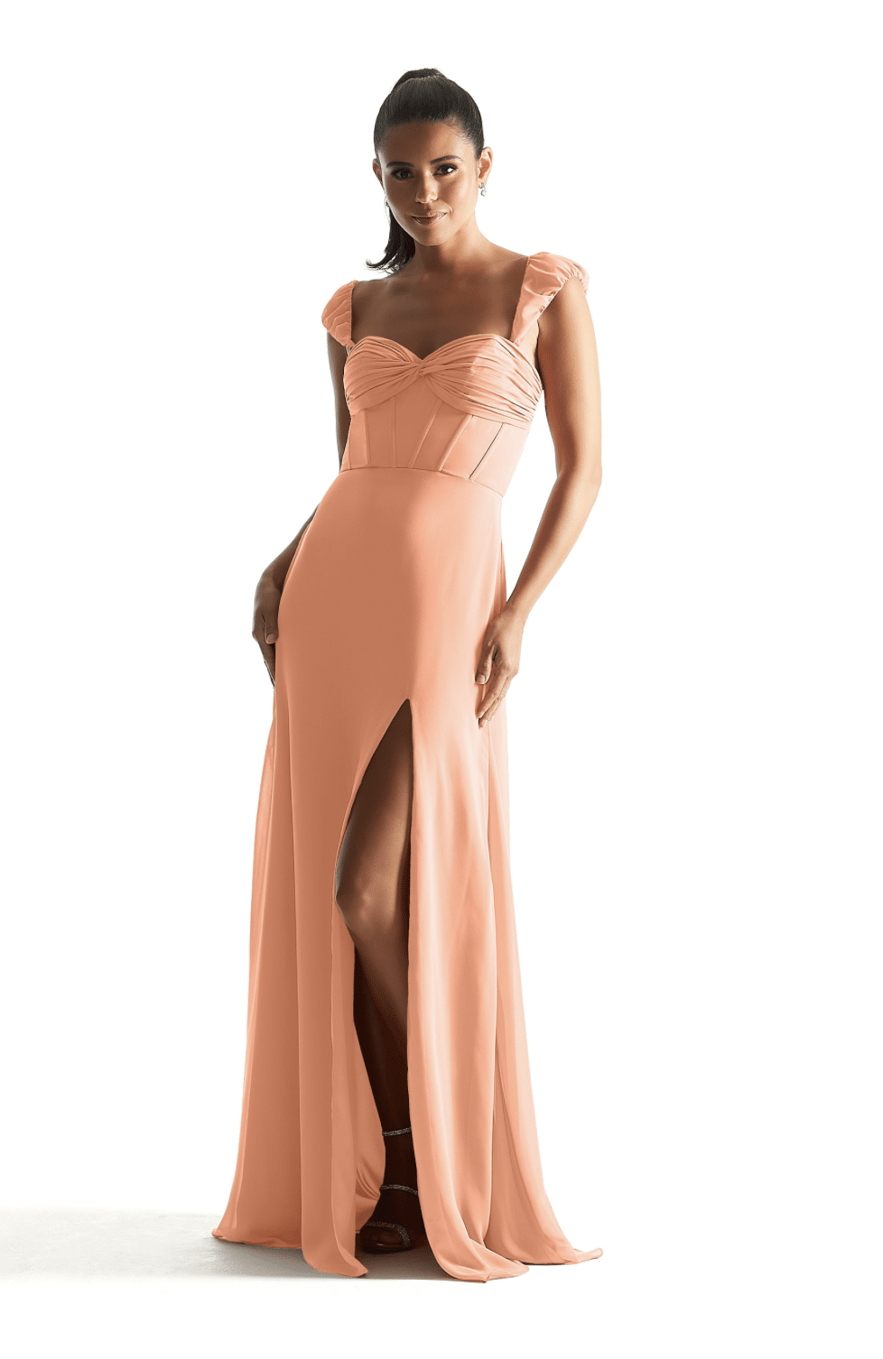 There are many shades of peach and your bridesmaids may prefer to go lighter or darker than the Pantone Peach Fuzz shade. Lana from SilkFred offers a Grecian style vibe and has a flattering ruched waist. Ivy from Romantica is another flattering A-line style and we love the keyhole detailing in the high neckline, which is also reflected on the back of the dress. Both of these styles are super flattering, elegant and feminine.